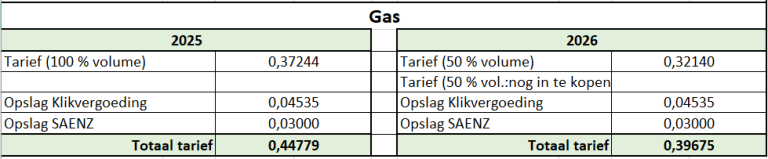 Onderstaand de ingekochte tarieven voor gas voor 2025 en 2026. Voor 2026 is dit nog niet het uiteindelijke tarief, zodra de resterende 50% is vastgesteld zal dat worden ge-update.