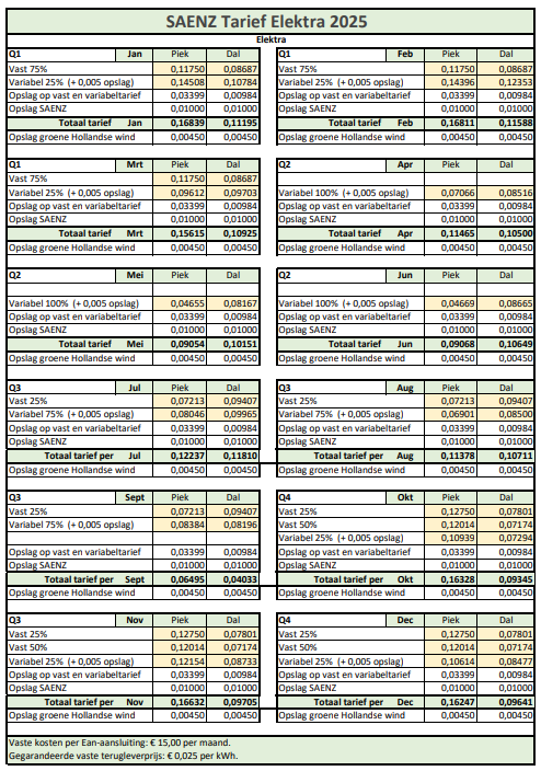 Onderstaand staan de uiteindelijke tarieven van elektra voor 2025. U kunt klikken voor een vergroting (.pdf).